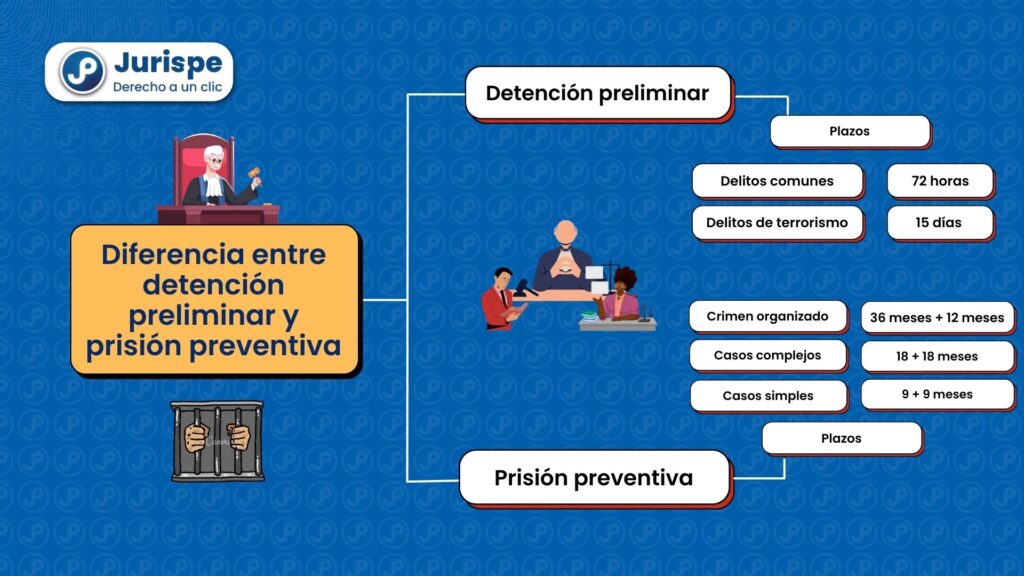 - La detención preliminar es una medida temporal para asegurar actos de investigación urgentes en la etapa preliminar y dura un máximo de 72 horas (ampliable). La prisión preventiva es una medida más severa para asegurar el desarrollo del proceso y la sentencia, se aplica en la investigación formalizada y requiere una audiencia judicial, con plazos más largos.