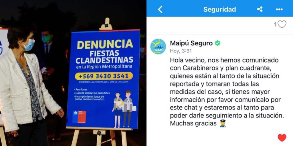En Chile, por ejemplo, con el regreso de la Región Metropolitana a la fase 2 del Plan Paso a Paso, el Ministerio de Salud (Minsal) habilitó un número de teléfono específico para denunciar infracciones de las restricciones sanitarias. Este número, el +56934303541, estaba disponible las 24 horas del día, los siete días de la semana, y garantizaba el anonimato de los denunciantes. El objetivo era que las personas informaran sobre fiestas clandestinas, reuniones sociales no autorizadas, incumplimiento del toque de queda, violación de la cuarentena y el no respeto de los aforos máximos en lugares públicos. Esta medida buscaba empoderar a la ciudadanía en la fiscalización del cumplimiento de las normas, pero también abrió el debate sobre la "vigilancia entre vecinos".